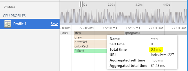 The game seems to be running a lot smoother at the higher frame-rate, with only a few frames being dropped now and then. When profiling the JavaScript a typical update for a