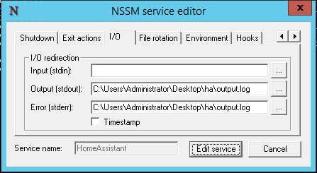At this point I tried running the service, only to be greeted with absolutely nothing in my browser. Thankfully nssm comes with a nifty I/O feature that allows you to redirect the stdin, stdout and stderr streams to / from files on disk. To enable this logging you will need to edit your home assistant service by running the following command: