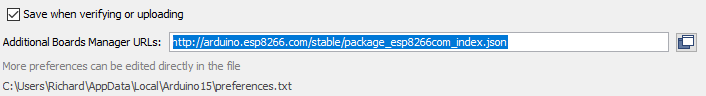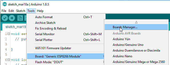 Next you will need to install the ESP8266 boards package which includes all the required files & tooling needed to compile and upload your sketches to your microcontroller.