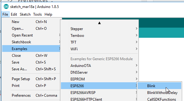 After you have installed the ESP8266 boards you should now load up the obligatory Blink / Hello World tutorial from the newly installed board examples.