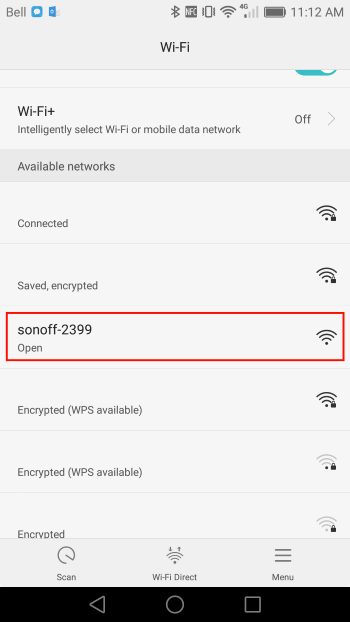 When your Sonoff first powers on it won't be able to connect to your WiFi network and will put itself into Access Point mode, this is indicated by the rapidly flashing green LED above. When the Sonoff is in AP mode it will create its own WiFi network that you can connect to with your phone / laptop and configure, in my case the sonoff-2399 network was created.