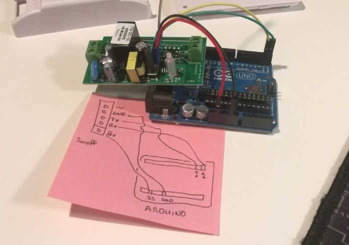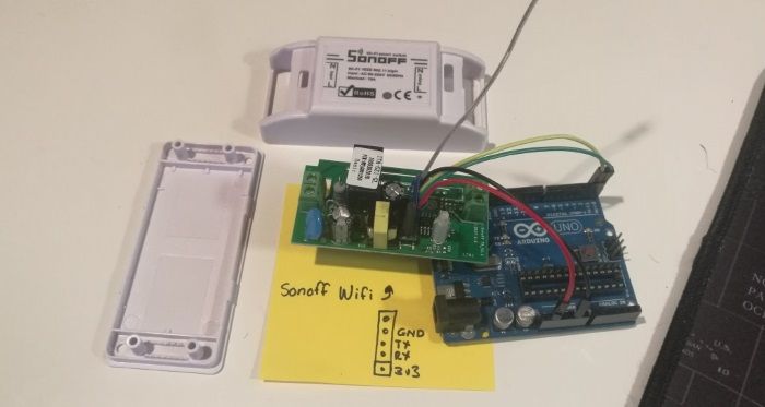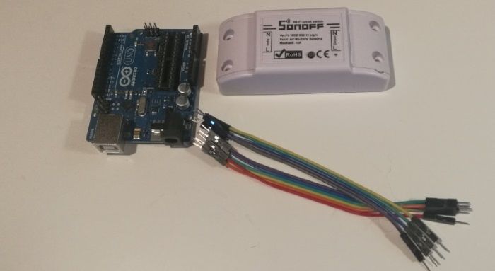 Next we will need to connect an ISP to the programming headers on your Sonoff device, depending on what ISP you are using this can vary slightly, however the general principle is the same. As mentioned earlier I am making use of an old Arduino UNO board with the processor removed as my programmer. Below you can see how I hooked it all up.
