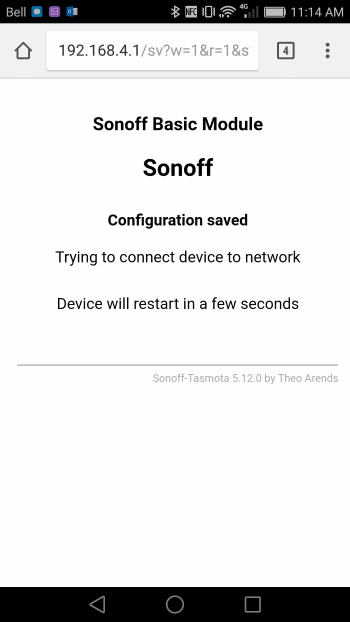 After the upload has completed your Sonoff should reboot and blink the green status LED indicating that it was unable to connect to a WiFi network, and as a result is in configuration / access point mode.