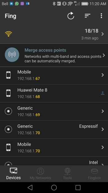 If you are like me and want to assign a static IP Address to your Sonoff once it has booted, or do not know what the initial IP Address assigned to it by your router is you can make use of Fing on your mobile device to discover your Sonoff: