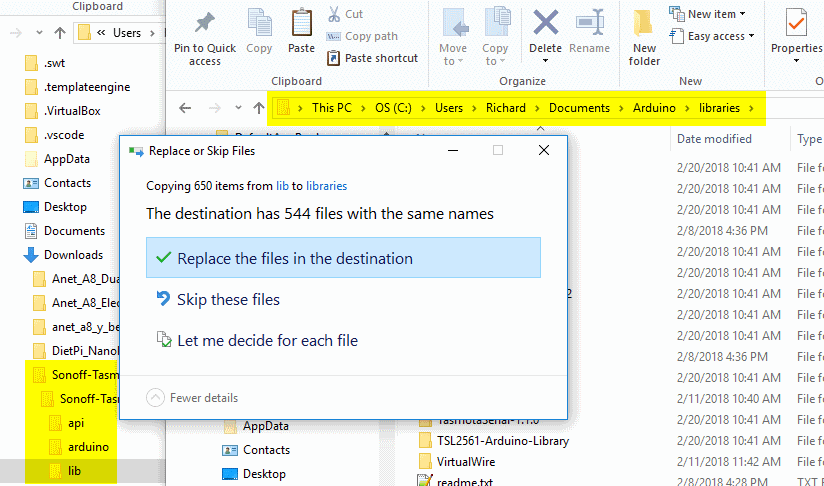 Once downloaded, extract the contents of the zip file to a local folder on your computer and ensure that your Arduino IDE is closed - we are going to be updating your Arduino's libraries folder with the ones included in the Tasmota zip file. To do this you will need to copy all contents from C:\<extracted-folder>\Sonoff-Tasmota-x.xx.x\lib into C:\Users\<user>\Documents\Arduino\libraries.