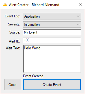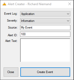 In a nutshell the Alert Maker application does just what its name says, it will allow the user to write a custom event log entry into a targeted Windows event log. This was useful to me at the time as I was developing custom management packs for SCOM 2007 R2 and I needed a quick way to trigger monitored events.