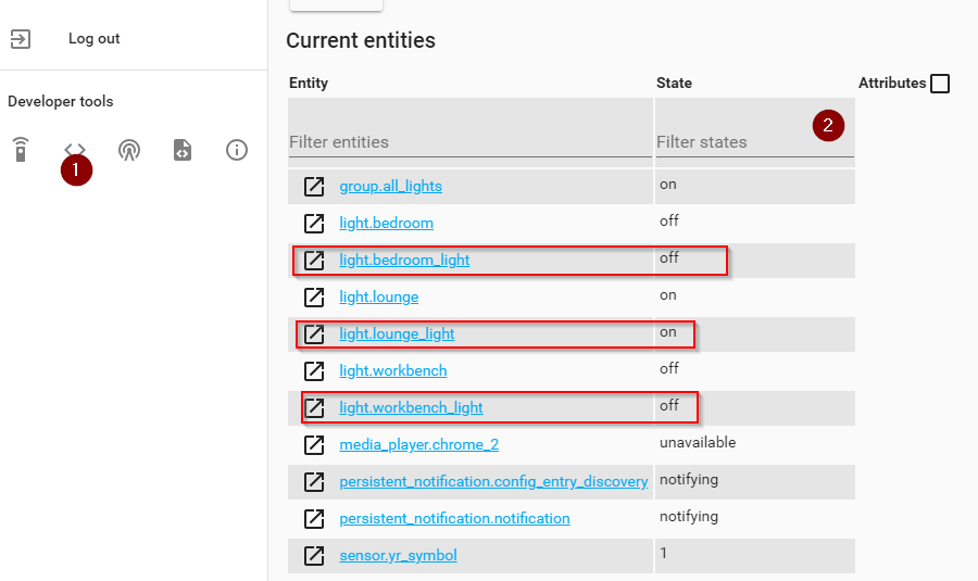 As you can see above, all my lights were successfully imported into Home Assistant along with what seem to be doubles of each bulb. These "doubles" are actually the rooms (groups) I have defined in the Philips Hue application, and are intended to quickly turn on / off all the lights in a defined room.