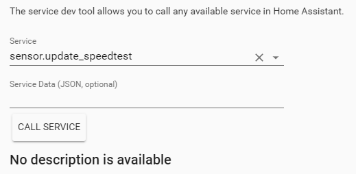 The service we are interested in calling is the sensor.update_speedtest service, to do this select it from the drop down list and click the call service button to execute it.