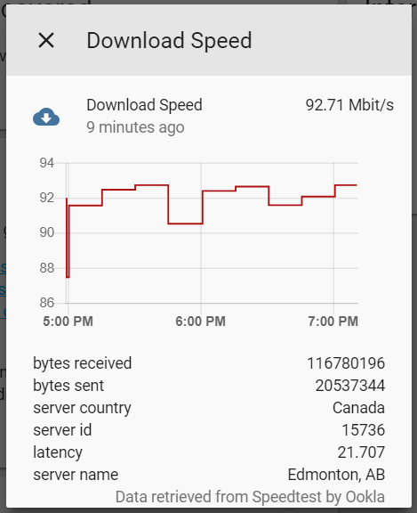 The above configuration will run a speed test every 15 min (0, 15, 30 and 45 past the hour), these counters will be stored via the recorder & history components.