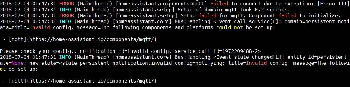 Should you run into trouble setting up MQTT, or do not see the mqtt.publish service above I would highly suggest looking at your Home Assistant log file for clues. Initially I had originally entered the incorrect MQTT broker port, and was alerted to it through the following error message.