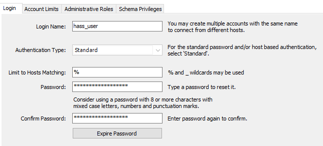 Be sure to generate a strong password for the account, along with allowing all hosts % to connect as this user - this is important as the user account will be coming in from your Home Assistant server and not your MySQL server's localhost.