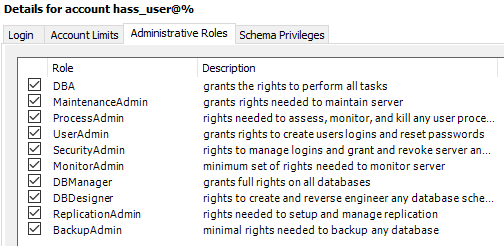 - Create an elevated user (with remote login) called hass_user associated with the new schema