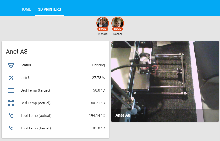 If you are wondering where to get the entity names specific to your 3D printer (e.g. sensor.anet_a8_job_percentag) you can get them through the states panel under the Developer Tools section of your Home Assistant instance.