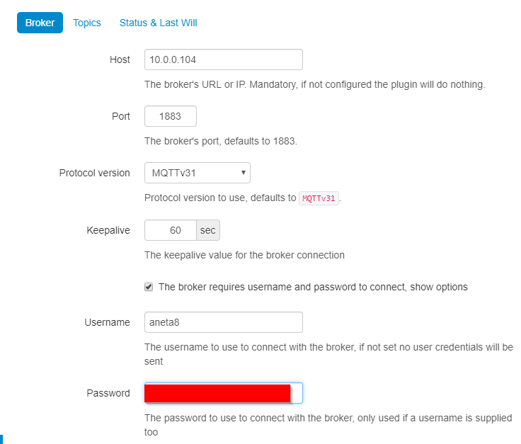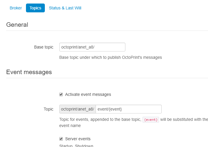 I would suggest picking a meaningful topic when setting up MQTT, especially if you are running more than 1 3D printer. In my case I will set this topic to octoprint/anet_a8/: