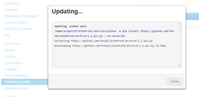 Provided that you followed the installation steps listed above you should be able to update OctoPrint through the web interface whenever there is a new release of the software.