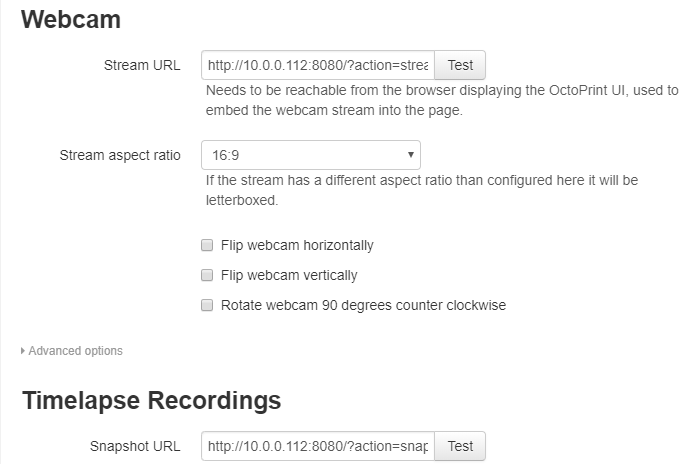 Open settings and navigate to the Webcam & Timelapse page, here we will enter in the following information: