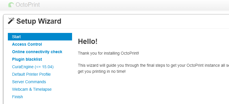 Once started you should be able to connect to OctoPrint in your web browser using the following URL http://<device-ip-address>:5000 so in my case that would be http://10.0.0.112:5000/. This will present you with the OctoPrint Setup Wizard - complete it as normal.