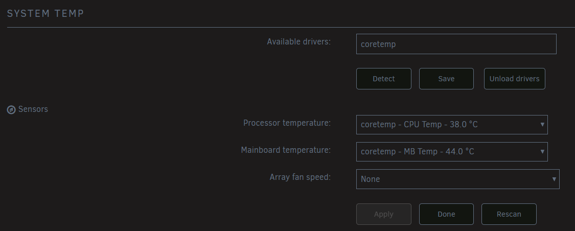 I make use of Dynamix System Temperature (above) to collect the temperatures of my CPU's, however I needed to assign one of my CPUs as the motherboard temperature in Unraid to work around a limitation with Dynamix System Temperature.