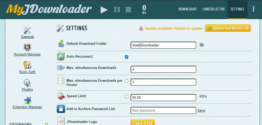 Used in conjunction with MyJDownloader you can easily send and manage downloads to your server through the provided Web UI.
