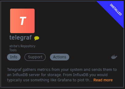 This will pull the latest image of Telegraf from Docker, generate and save a configuration file to /mnt/user/appdata/telegraf/telegraf.conf on your server.