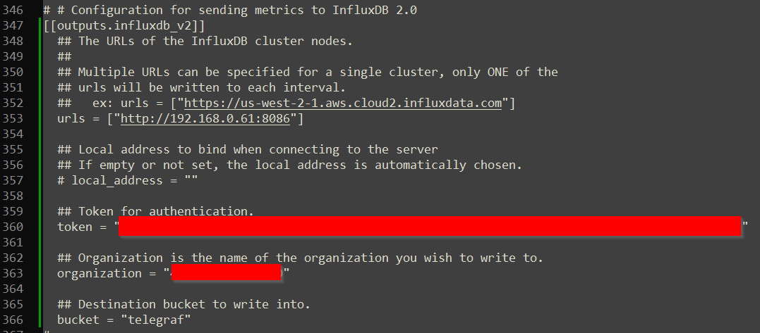 Find the [[outputs.influxdb_v2]] section, uncomment it, and enter in your InfluxDB connection details. Once done it should look something like the below: