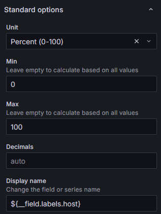 Under the standard options section, set the unit to percentage, and use ${__field.labels.host} for the display name.